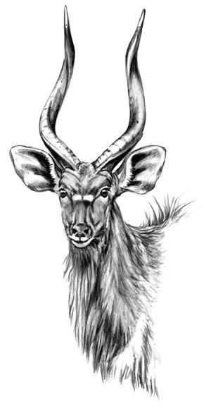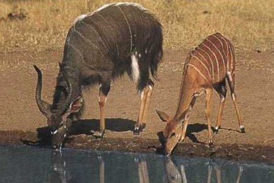 "Der Nyala ist eine afrikanische Antilope aus der Gruppe der Waldböcke. Weibchen und Männchen lassen sich vor allem anhand ihrer Körperfärbung unterscheiden: während die viel größeren männlichen Tiere schiefergrau gefärbt sind und schraubenartig gedrehte Hörner tragen, die mit einer weißen Spitze versehen sind, sind die weiblichen Tiere ebenso wie Jungtiere hornlos und überwiegend rötlich braun gefärbt. Alle Tiere haben bis zu 18 schmale, weiße Querstreifen. Die Männchen tragen sowohl eine lange, erektile Mähne, die das Rückgrat bedeckt, als auch von der Kehle bis zu den Hinterläufen hängende Zotteln. Der buschige Schwanz ist bei beiden Geschlechtern an der Unterseite weiß."
